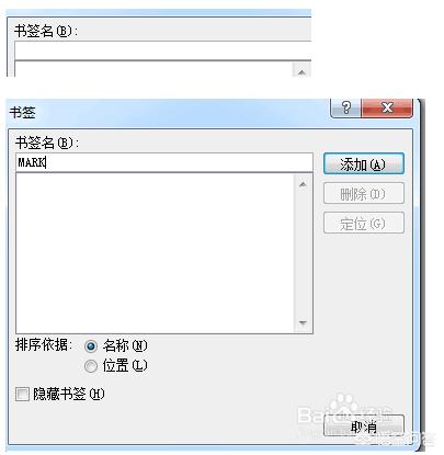 4、在出现的界面中,在第一行的“书签名”中输入你所想设置的书签名,比如说输入“MARK”
