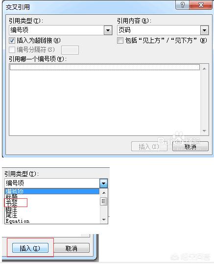 7,点击“交叉引用”,将出现如下界面,点击“引用类型”的中的“书签“选项,再点击插入,即可在文档中出现之前被设置为书签的文字了