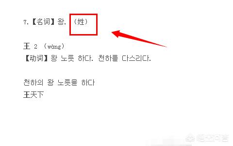 4、在出现的所有释义当中,有一条会标注“(姓)”,那么这一个韩语字“왕"就是姓氏"王"的翻译了。