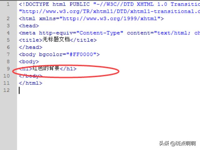 4、下面我们在下面加个标题,在<body>下面添加,添加内容随意。<h1>红色的背景</h1>