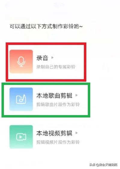 3、此页很明晰的给出,咱们可以采用录音来做为专独的彩铃,也能从本地的挑纳来择剪,轻按首栏。