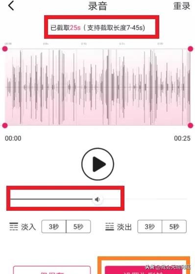 4、点触粉圈钮,各自可以自由发声,或是录下其他的声效亦可,依照拉动圆点自如截取秒数,之后还可做此试听,最后设彩即可。