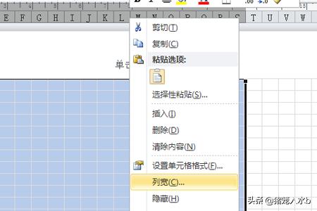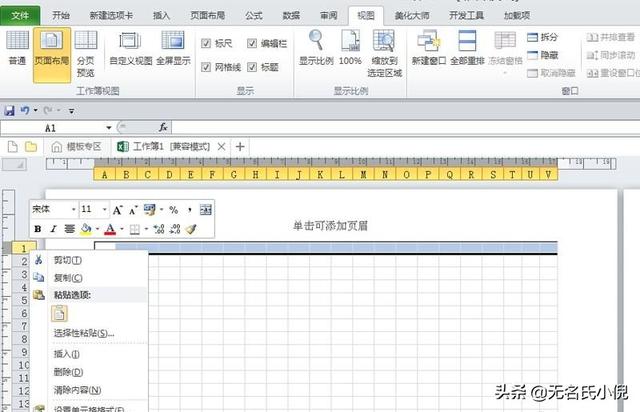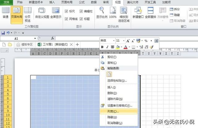 第二步执行视图-页面布局命令,接着选择a-s列,右键单击选择列宽。