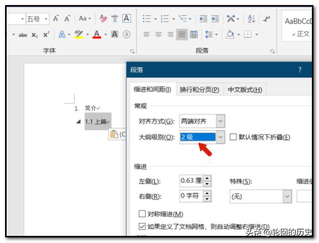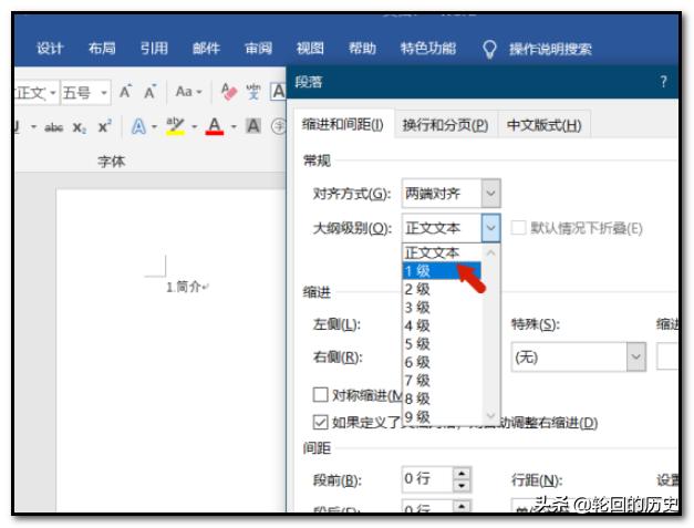 3、弹出段落设置窗口,把常规下的大纲级别,修改为一级。