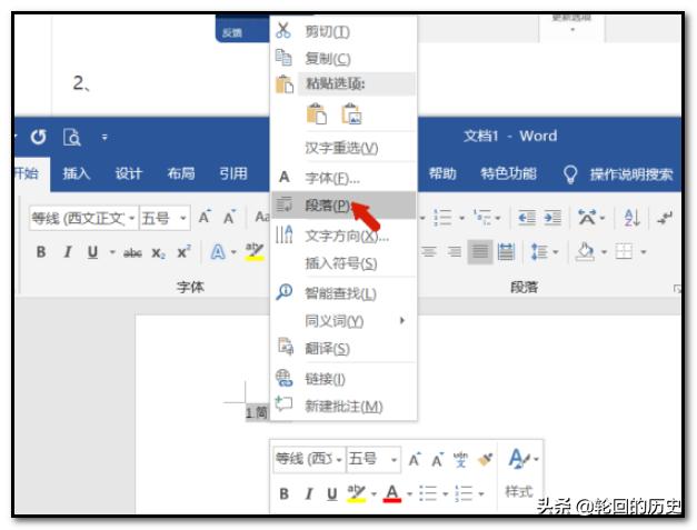 2、打开office word办公文档,选择需要设置为主目录的文字,单击鼠标右键,选择段落菜单。