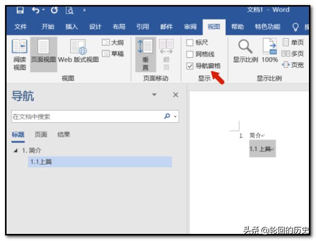 5、把鼠标移动到上方菜单栏中的视图窗口,找到下方的导航窗格工具并勾选可以看到,在左侧导航窗口中已经显示导航标题链接了,然后点击即可导航到指定位置。