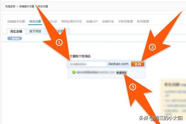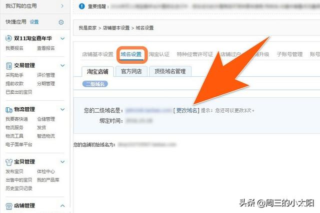 第三步:在“域名设置”中,选择“淘宝店铺”,再点击下方的“更改域名”;