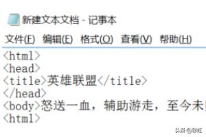 3、接下来举个例子在<title></title>中间输入网页标题(如英雄联盟)在<body></body>中输入“怒送一血,辅助游走,至今未归。。。。”完成后点击保存,并将记事本重命名为***.html格式。(这样记事本会变成网页IE版的格式),然后在此打开按F12打开游览器游览网页效果。